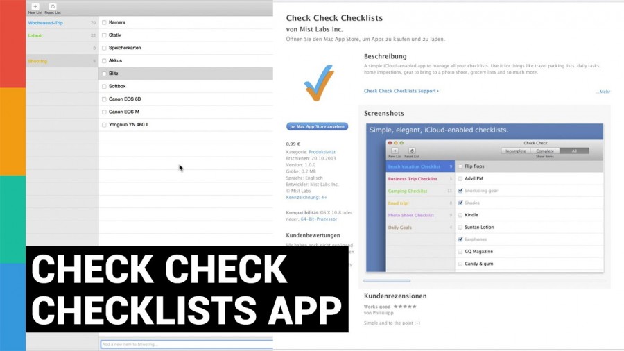 In diesem Video zeige ich euch eine App für Mac OS X & iOS, die ich im täglichen Fotografie-Leben und auch privat nicht mehr missen möchte. Die Check Check Checklists App hilft bei der Organisation und spart einiges an Zeit.